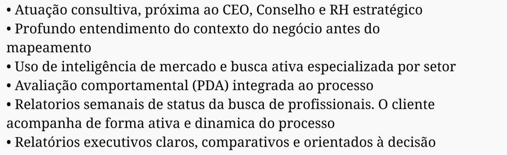 Nosso foco não é apenas preencher posições, mas reduzir riscos de contratação, garantindo alinhamento técnico, comportamental, cultural e estratégico entre o profissional e o desafio do negócio.