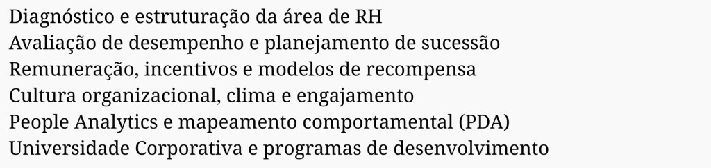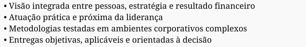 Atuamos como parceiros do RH e da liderança, trazendo visão sênior, experiência prática e abordagem orientada a negócio para fortalecer os pilares que sustentam o crescimento organizacional.