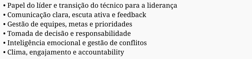 O foco está em preparar líderes para atuar de forma consistente no dia a dia, compreendendo seu papel na condução de pessoas, na execução da estratégia e na construção de um ambiente de confiança e performance.