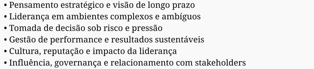 Líderes mais estratégicos, preparados para decisões críticas, com maior clareza de impacto, consistência de atuação e capacidade de sustentar resultados no médio e longo prazo.